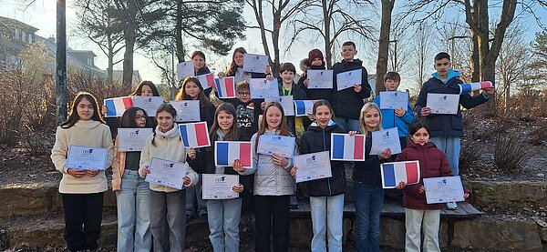 Sichtlich stolz halten sie ihre Urkunden in die Höhe und freuen sich über ihren Erfolg beim französischen Internet-Teamwettbewerb! Die Rede ist von den 24 Sechstklässlern der Französischklasse 6b/c des Hölderlin-Gymnasiums Lauffen a.N., welche zwei Wochen zuvor – am 22. Januar 2025 – anlässlich des Deutsch-Französischen Tages am Internet-Teamwettbewerb langue et cultures teilgenommen haben.