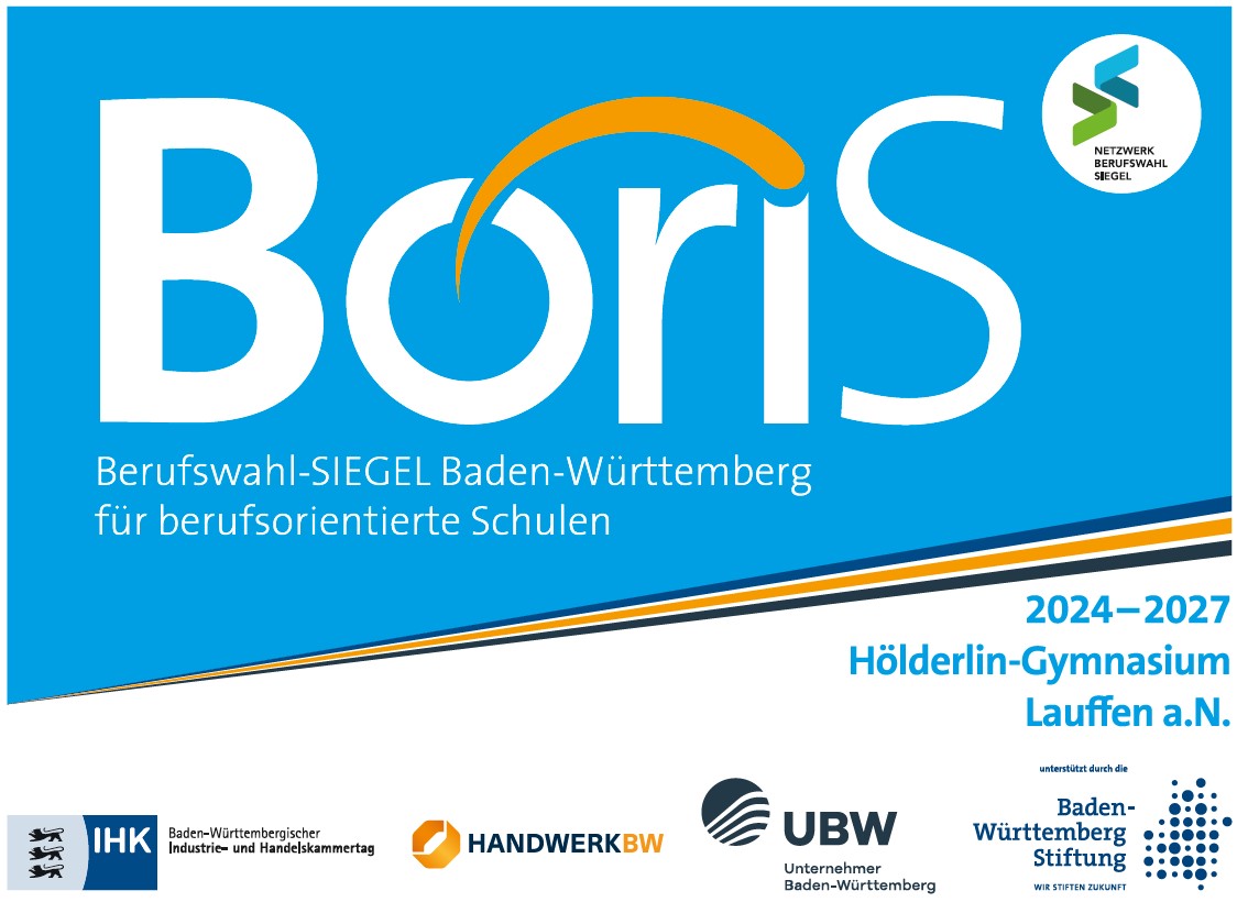 Das BoriS-Berufswahl-Siegel Baden-Württemberg ist ein Zertifizierungsverfahren für Schulen, die sich in der Berufs- und Studienorientierung in besonderem Maße engagieren. Nach der erfolgreichen Bewerbung im vergangenen Schuljahr darf sich das Hölderlin-Gymnasium seit Juli mit dieser Auszeichnung schmücken.